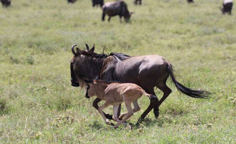 Wildebeest crossing the plains during the Great Migration in Tanzania.